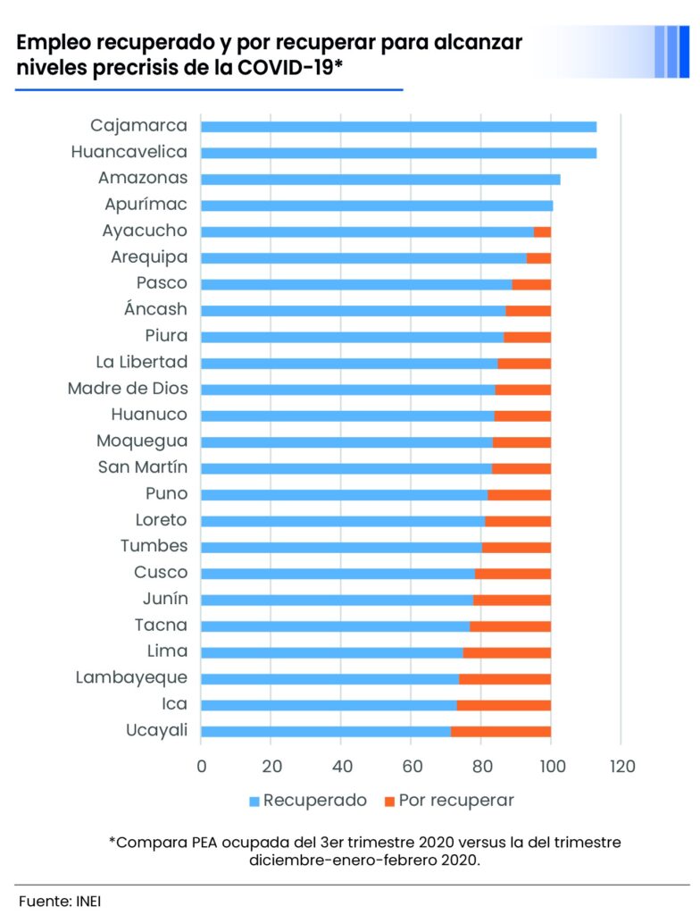 Por su parte, las regiones donde el empleo llega a representar entre el 85% y 95% de su población ocupada precrisis son La Libertad, Piura, Áncash, Pasco, Arequipa y Ayacucho. El déficit aún es de 436.000 puestos de trabajo, concentrados en Piura (145.000) y La Libertad (120.000). Algunas regiones ya lograron superar sus niveles de ocupación precrisis, son Apurímac, Amazonas, Huancavelica y Cajamarca.