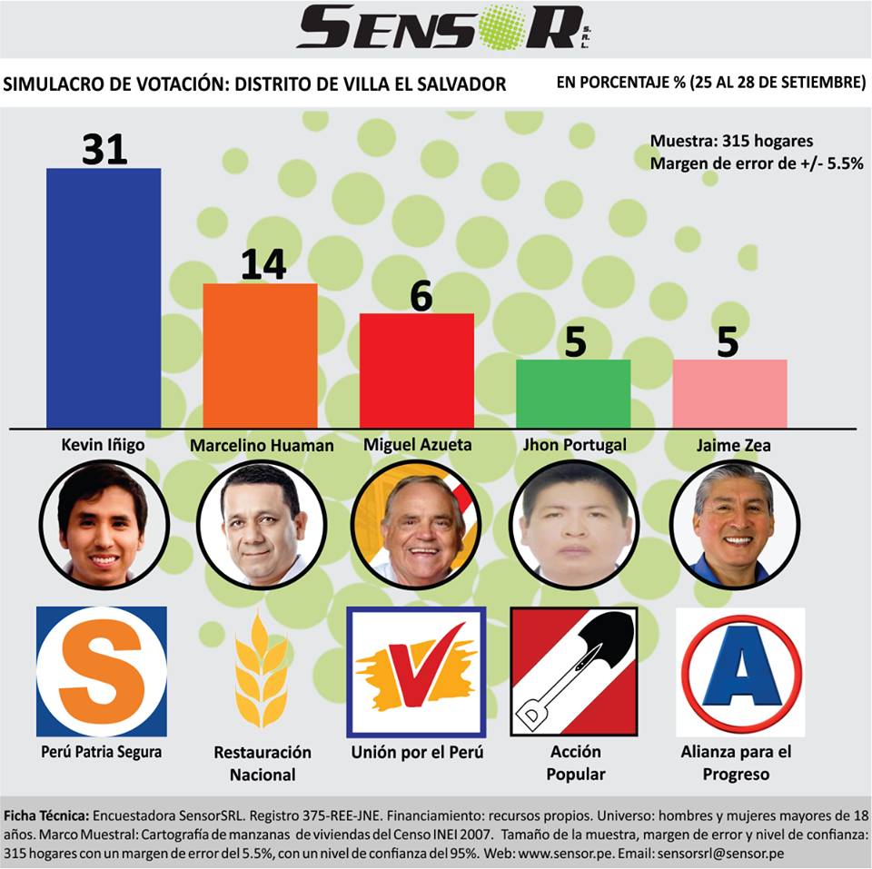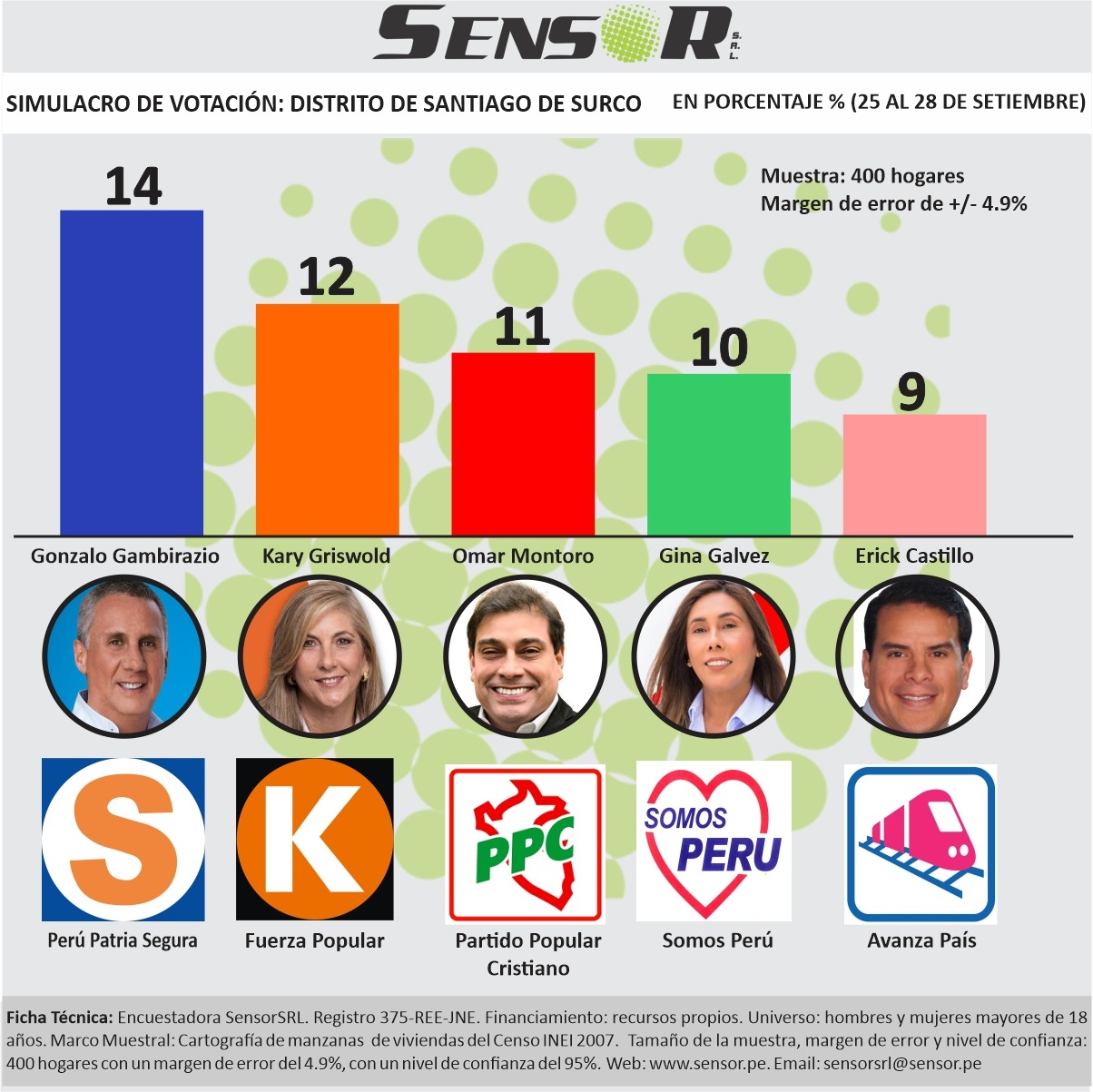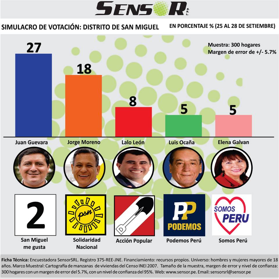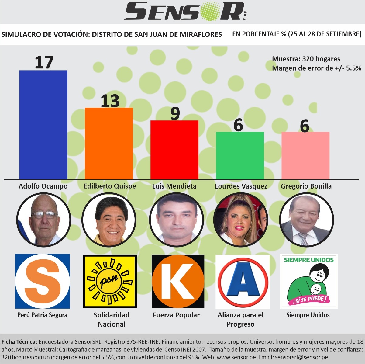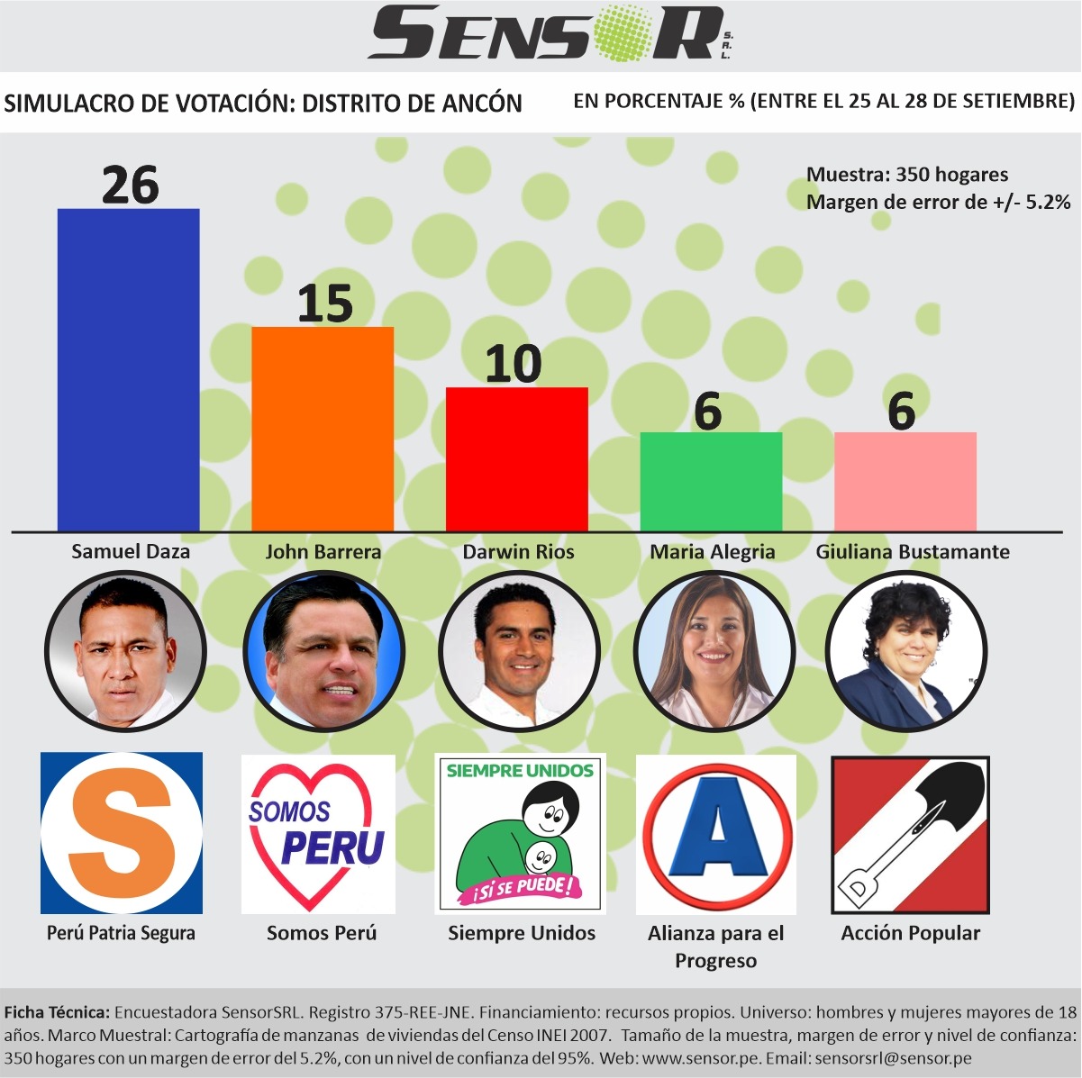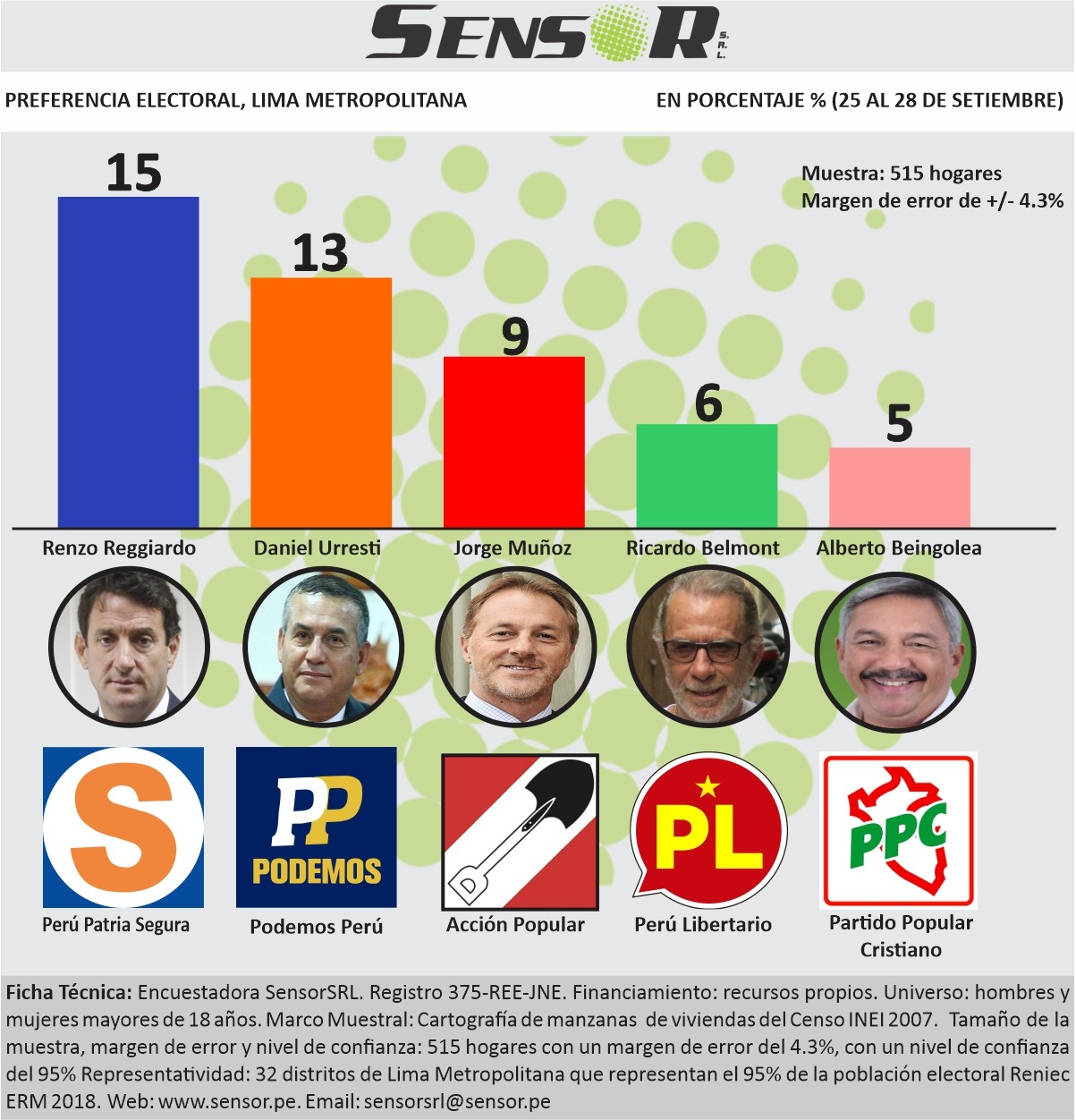 A una semana de las Elecciones Regionales y Municipales, a nivel de la Provincia de Lima tenemos que encabeza la intención de voto el candidato Renzo Reggiardo de Perú Patria Segura con 15%, le sigue el ex Ministro Daniel Urresti de Podemos Perú con 13%, en tercera posición Jorge Muñoz de Acción Popular con 9%, seguido de Ricardo Belmont de Perú Libertario 6%, Alberto Beingolea del PPC 5%, entre otros.