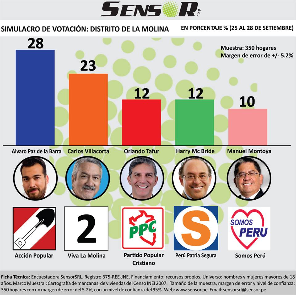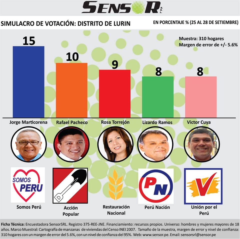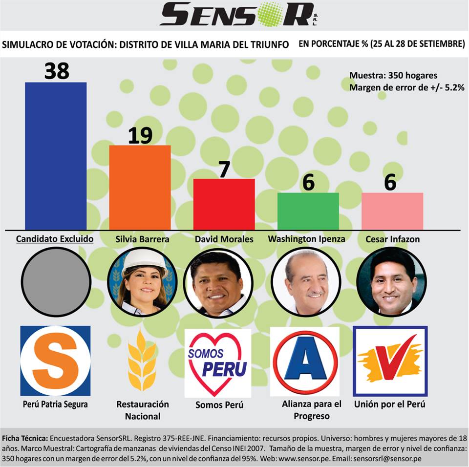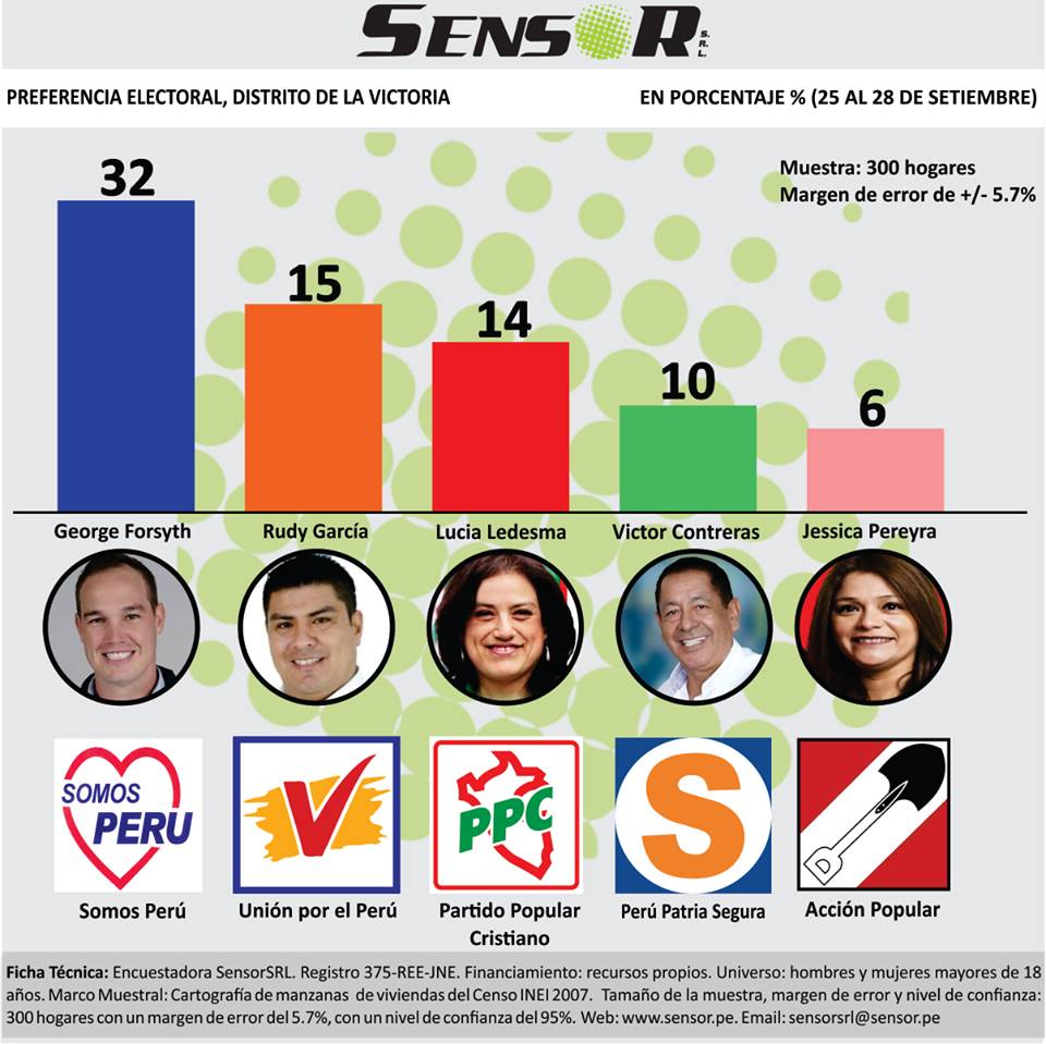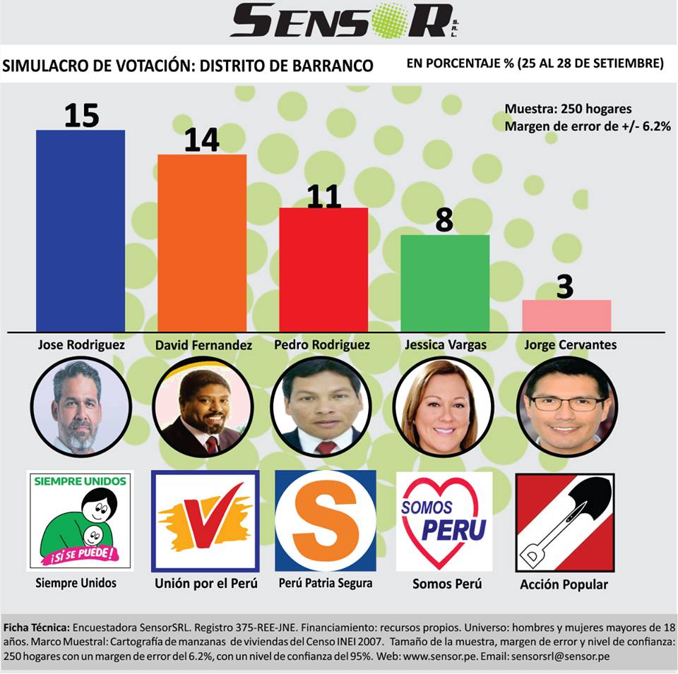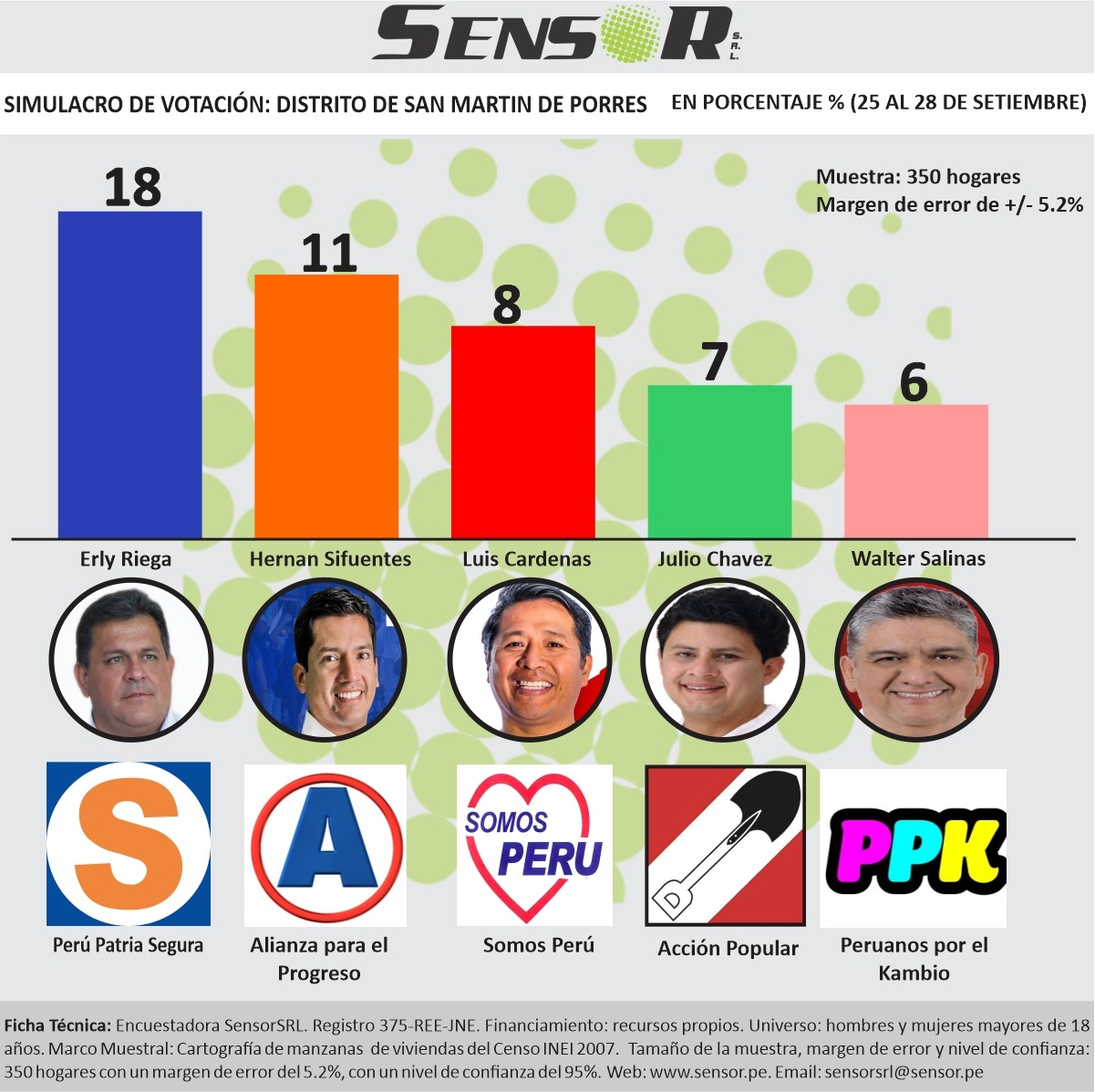 A una semana de las Elecciones Regionales y Municipales, a nivel de la Provincia de Lima tenemos que encabeza la intención de voto el candidato Renzo Reggiardo de Perú Patria Segura con 15%, le sigue el ex Ministro Daniel Urresti de Podemos Perú con 13%, en tercera posición Jorge Muñoz de Acción Popular con 9%, seguido de Ricardo Belmont de Perú Libertario 6%, Alberto Beingolea del PPC 5%, entre otros.