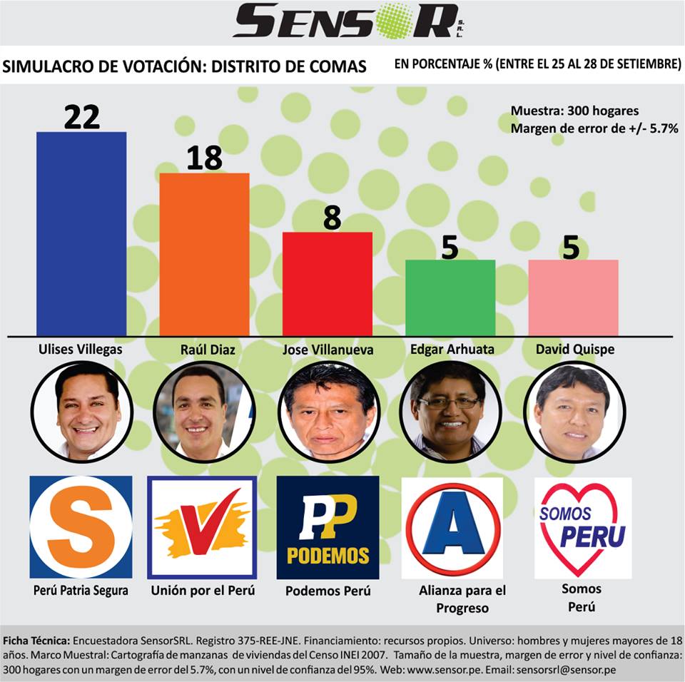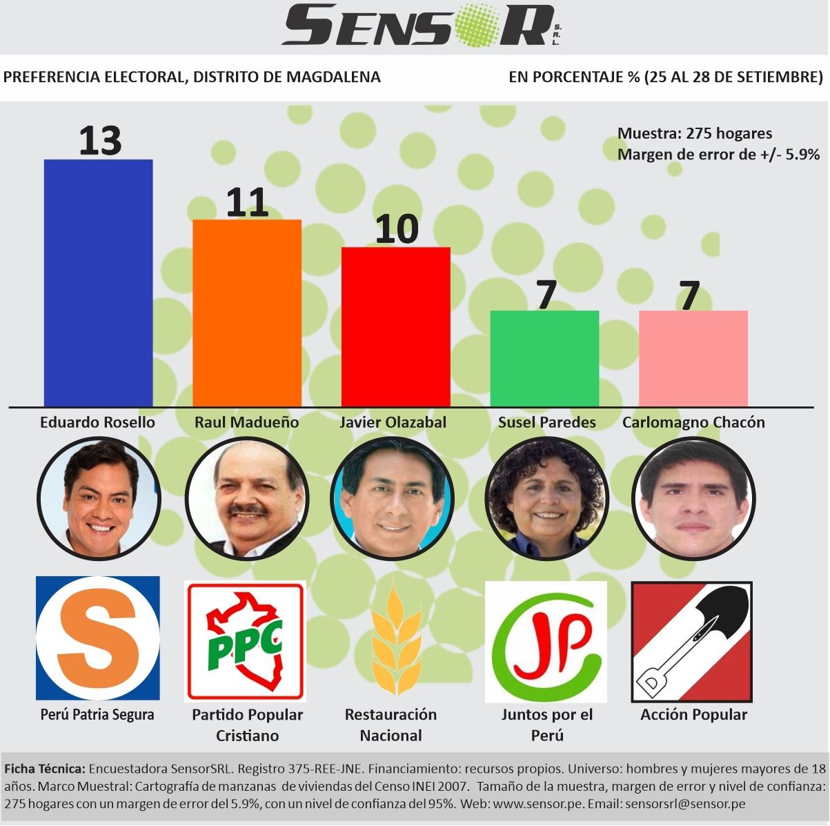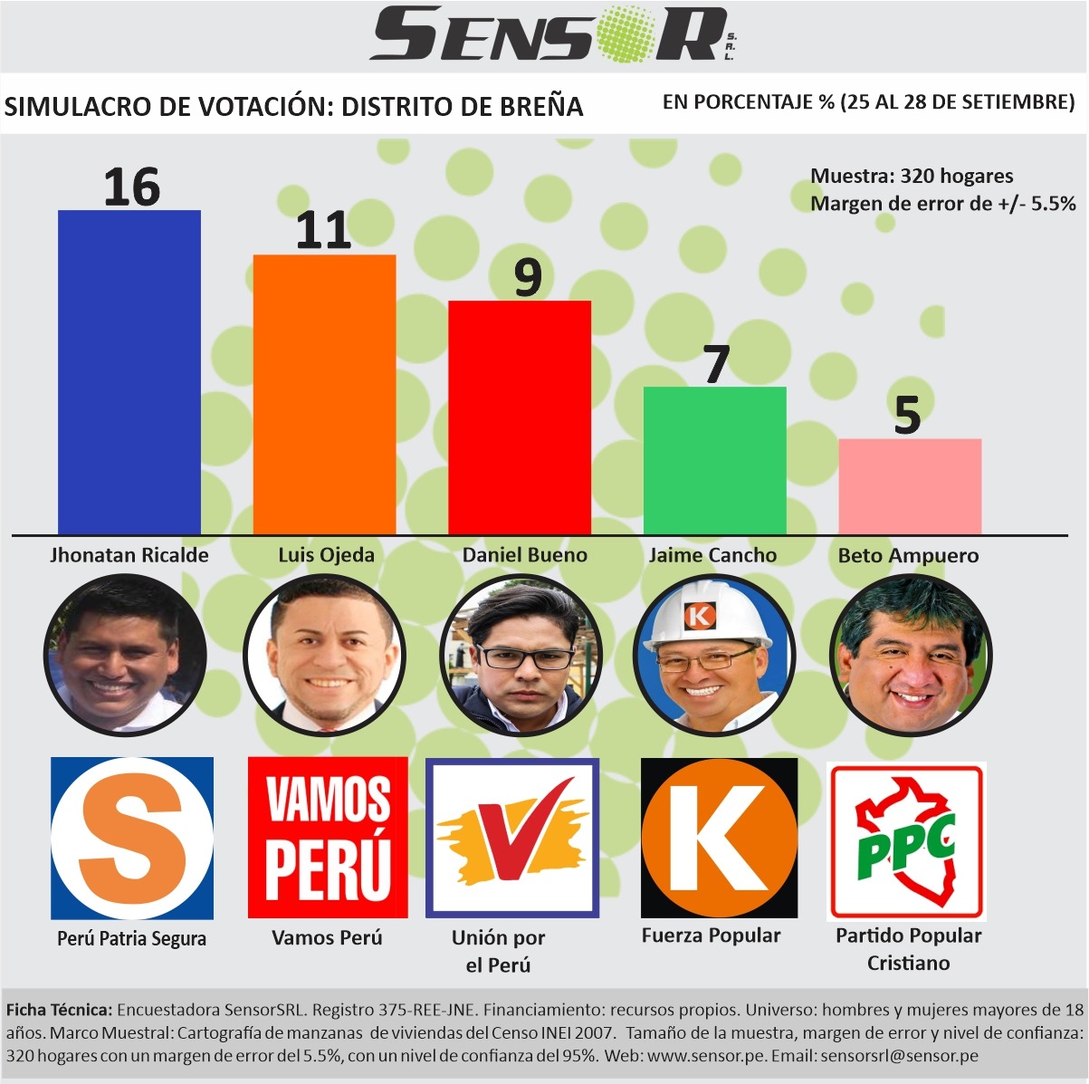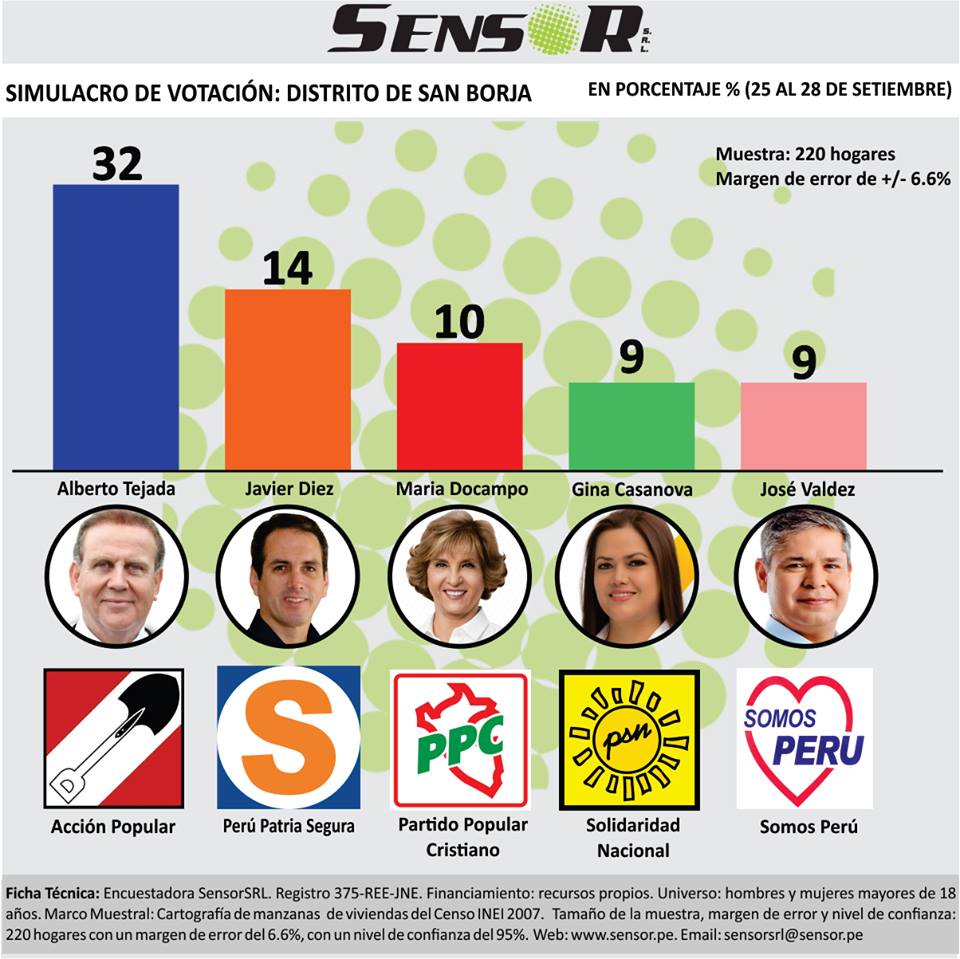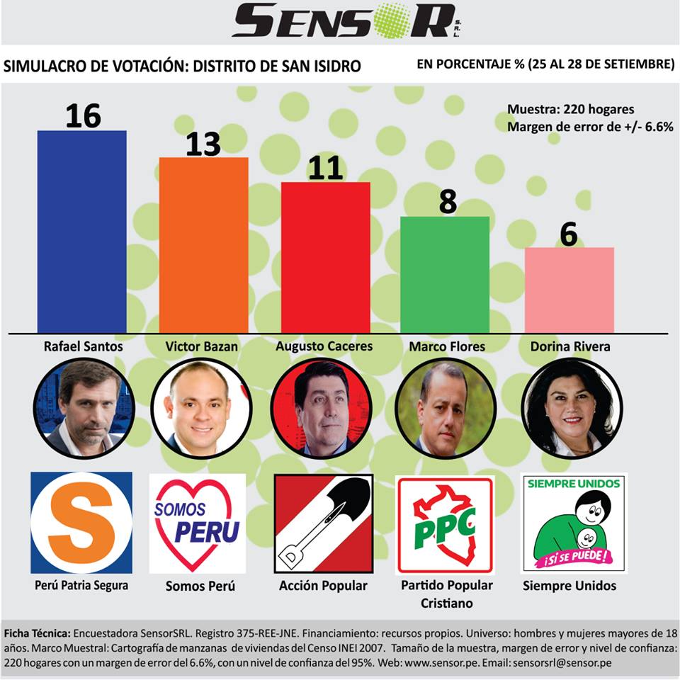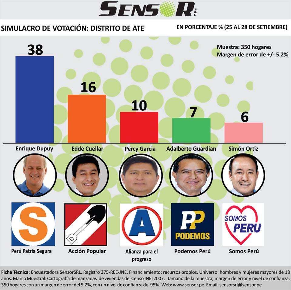 A una semana de las Elecciones Regionales y Municipales, a nivel de la Provincia de Lima tenemos que encabeza la intención de voto el candidato Renzo Reggiardo de Perú Patria Segura con 15%, le sigue el ex Ministro Daniel Urresti de Podemos Perú con 13%, en tercera posición Jorge Muñoz de Acción Popular con 9%, seguido de Ricardo Belmont de Perú Libertario 6%, Alberto Beingolea del PPC 5%, entre otros.