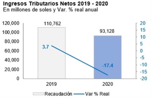 El monto de ingresos tributarios del 2020 representó 17,634 millones de soles menos a lo registrado en el 2019 y una contracción de 17.4% de la recaudación. Se trata de un porcentaje menor al 22.5% proyectado en el Marco Macroeconómico Multianual (MMM) revisado a agosto.